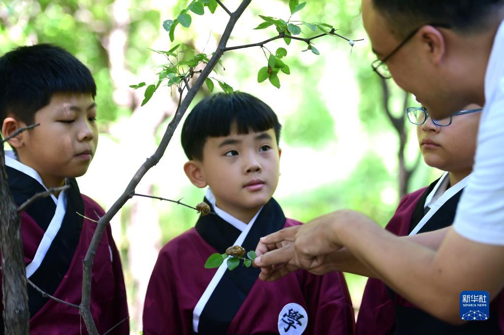 7月15日,參加中醫藥文化主題夏令營(yíng)的小學(xué)生在野外了解中藥蟬蛻。