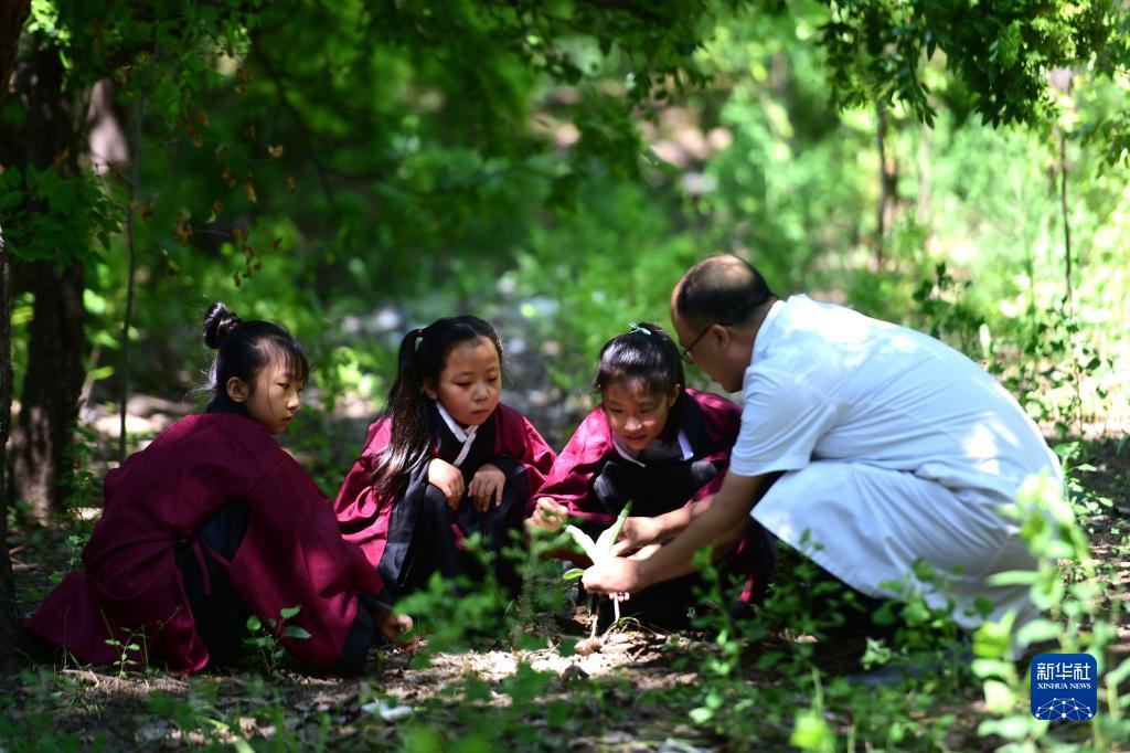 7月15日,中醫指導參加中醫藥文化主題夏令營(yíng)的小學(xué)生在野外采藥。