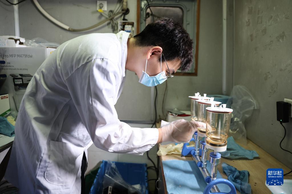 6月30日,第六次南海深潛及遠海鯨類(lèi)科考航次的科研人員在進(jìn)行水樣過(guò)濾。