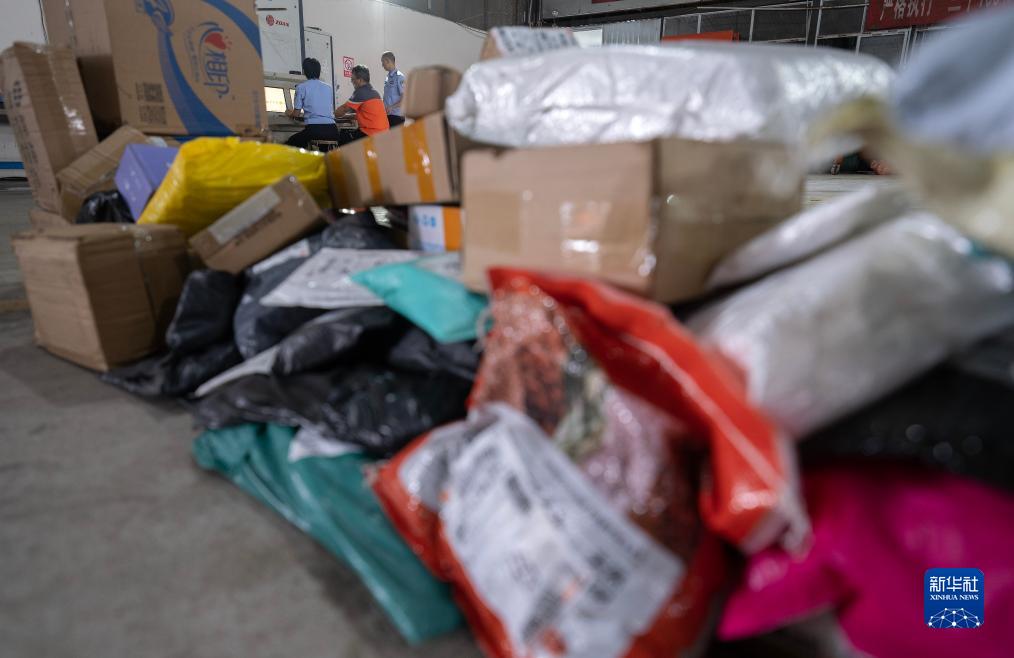 7月12日,尹銘燕(左)和同事在芒市一處物流點(diǎn)對快遞包裹進(jìn)行查緝。