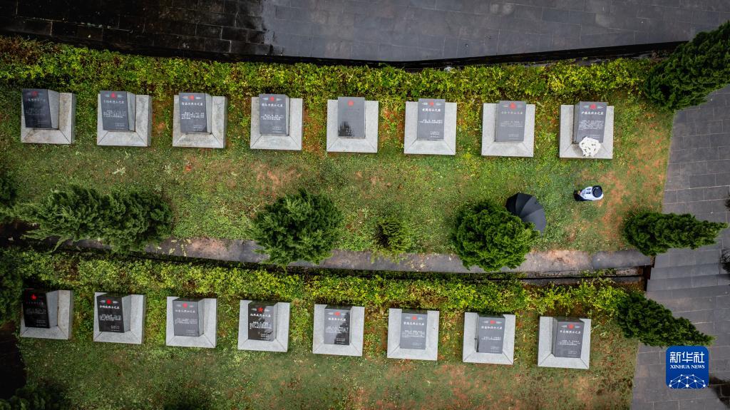 7月12日,尹銘燕在隴川縣烈士陵園祭奠犧牲的哥哥尹銘志(無(wú)人機照片)。