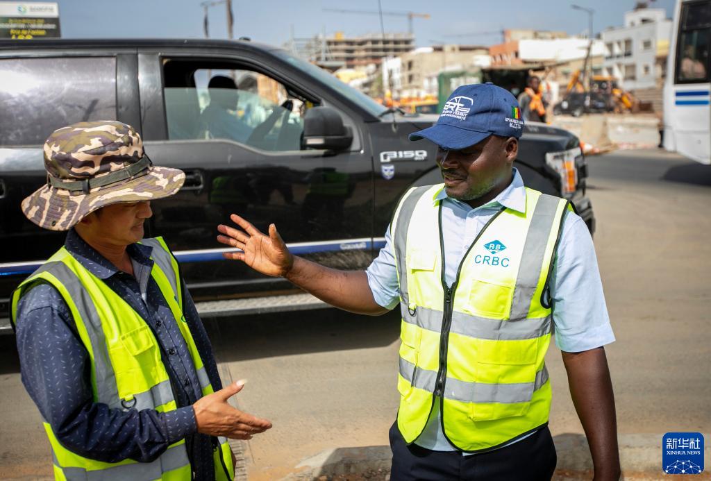 5月13日,蘇信(右)在塞內加爾達喀爾快速公交項目建設工地與同事交流。新華社記者 李亞輝 攝