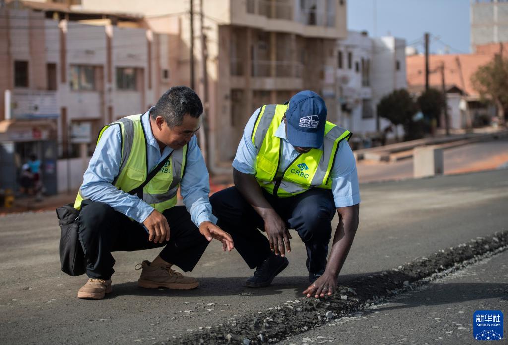 5月13日,在塞內加爾達喀爾快速公交項目建設工地,蘇信(右)檢查工程質(zhì)量。新華社記者 李亞輝 攝