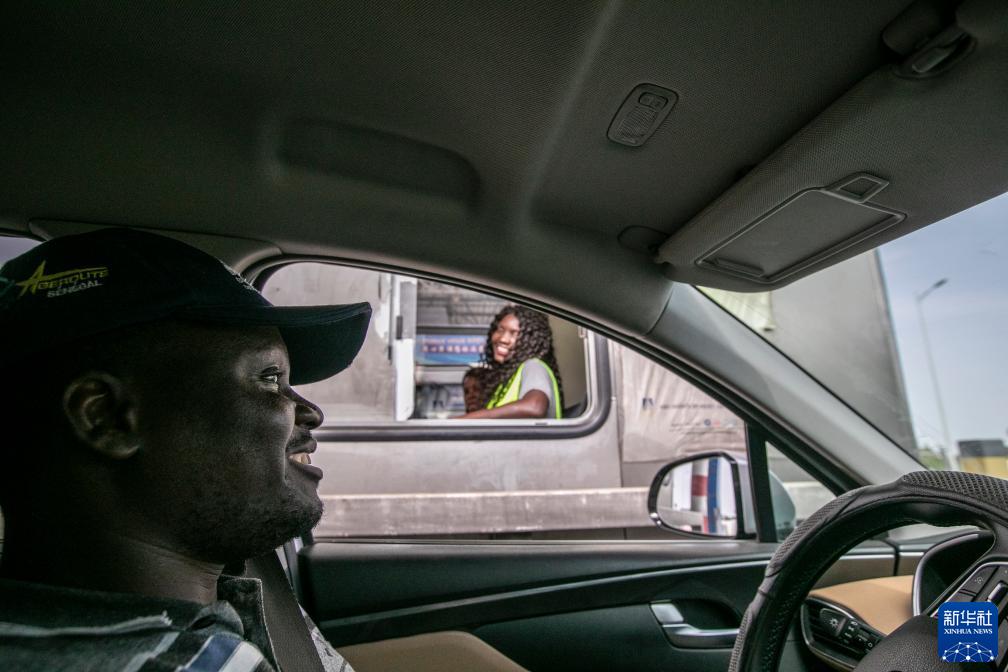5月13日,蘇信開(kāi)車(chē)經(jīng)過(guò)塞內加爾捷斯-圖巴高速公路捷斯收費站時(shí),與妻子莫妮克短暫交流。新華社記者 李亞輝 攝