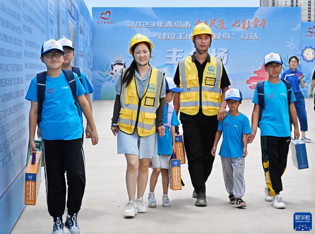 7月15日,在山東青島中鐵建工上合大廈項目部,兩名工人領(lǐng)著(zhù)“小候鳥(niǎo)”前往工地參觀(guān)。