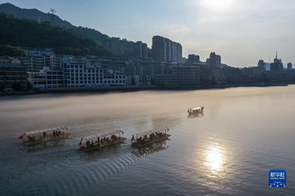 盛夏時(shí)節,浙江省建德市新安江景區推出特色清涼漂流,“竹筏”型游船視野更開(kāi)闊、親水性更佳。新安江水質(zhì)清澈,水溫常年在12-17℃,當江水與空氣溫差較大時(shí),便會(huì )在江面上形成一層霧氣。每年夏季的清晨和傍晚,清涼的新安江水和江上夢(mèng)幻奇霧吸引各地游客前來(lái)避暑度假。