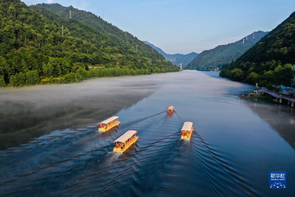 盛夏時(shí)節,浙江省建德市新安江景區推出特色清涼漂流,“竹筏”型游船視野更開(kāi)闊、親水性更佳。新安江水質(zhì)清澈,水溫常年在12-17℃,當江水與空氣溫差較大時(shí),便會(huì )在江面上形成一層霧氣。每年夏季的清晨和傍晚,清涼的新安江水和江上夢(mèng)幻奇霧吸引各地游客前來(lái)避暑度假。