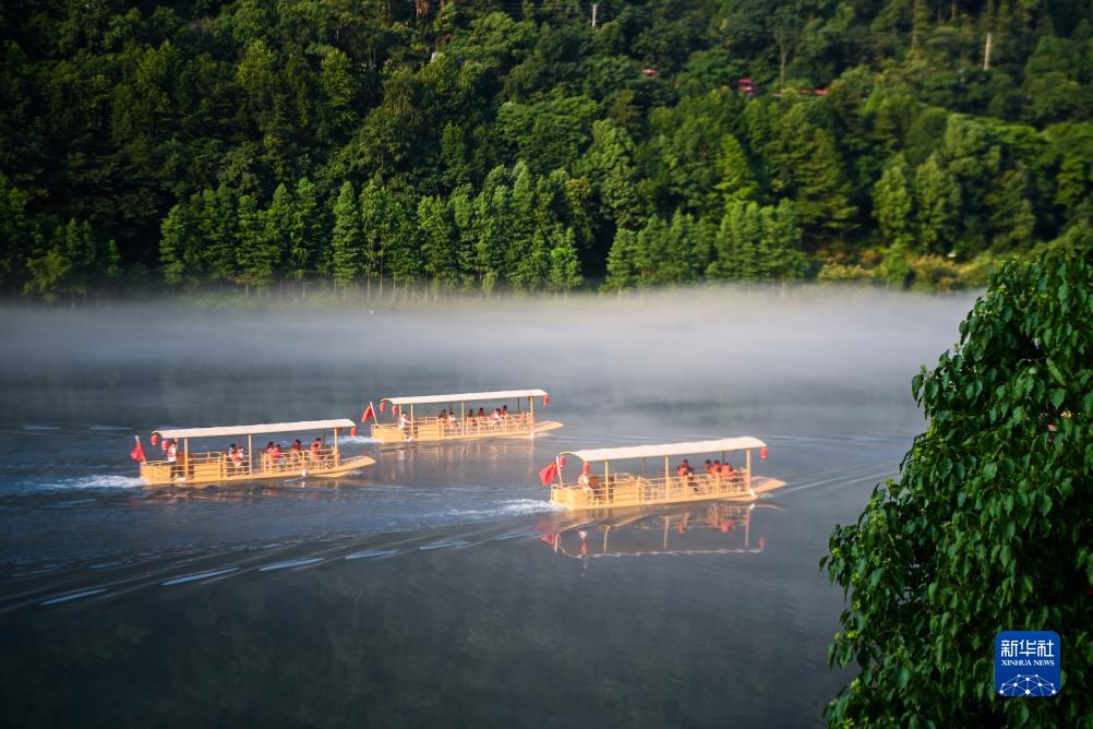 7月16日清晨,游客乘坐“竹筏”造型電動(dòng)游船,在建德新安江的江霧中前行。