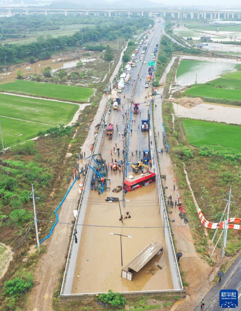 7月16日,在韓國忠清北道清州市,救援人員進(jìn)行抽水和搜救作業(yè)(無(wú)人機照片)。