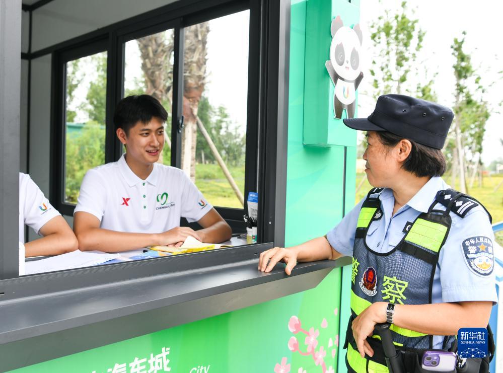 在成都市龍泉驛區東安湖體育公園,杜以萍(右)外出巡查時(shí)路過(guò)成都大運會(huì )城市志愿服務(wù)小站,與正在擔任志愿者的兒子周柯名交流(7月12日攝)。