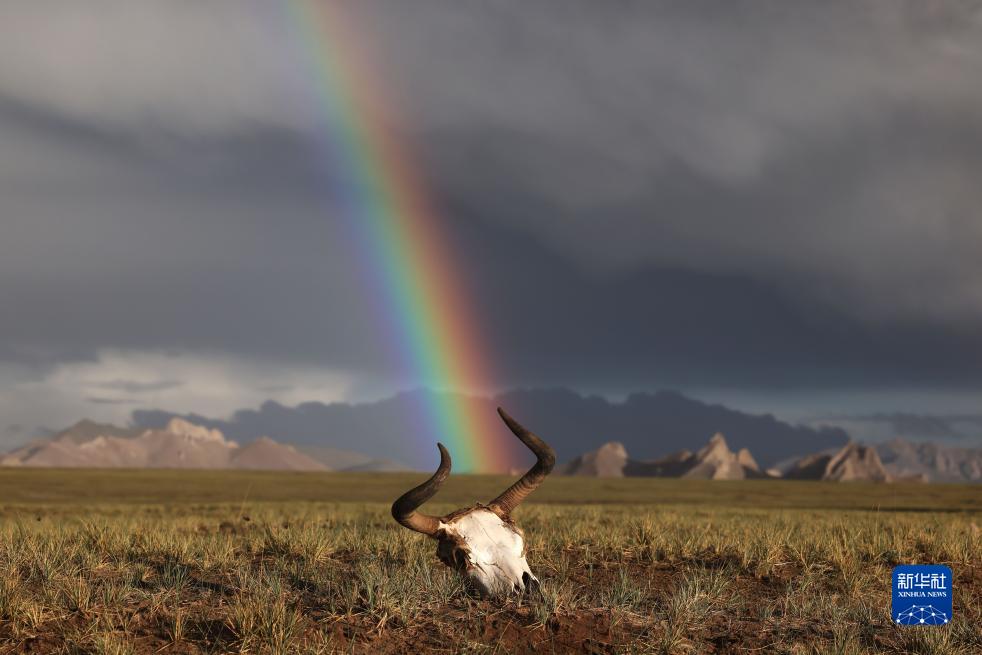 7月10日在新疆阿爾金山國家級自然保護區拍攝的野牦牛頭骨。