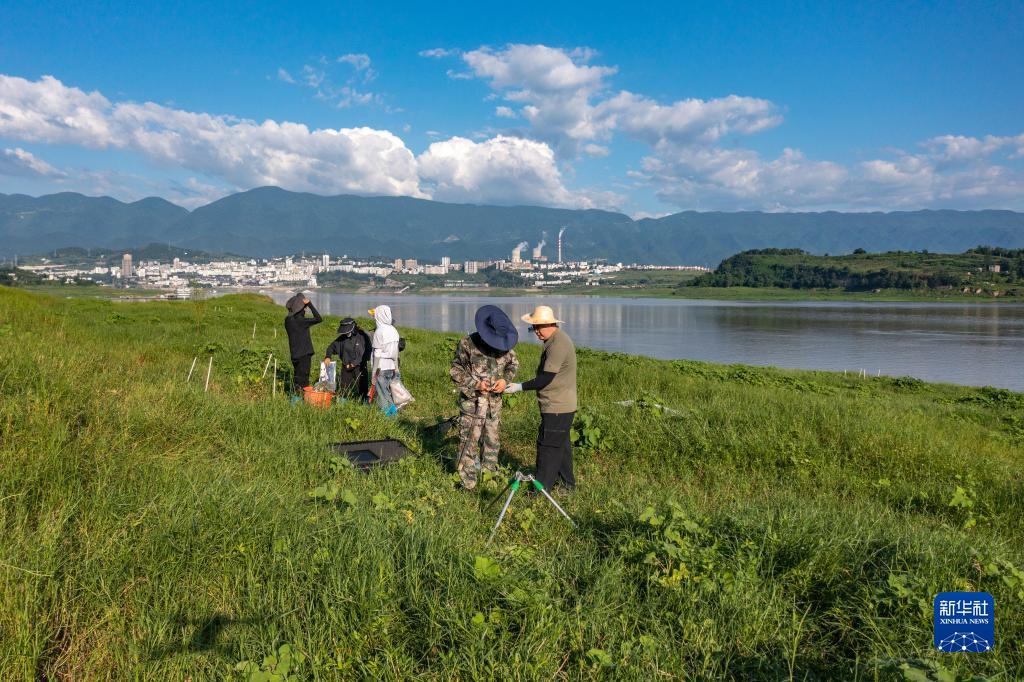 在中國科學(xué)院三峽庫區水土保持與環(huán)境研究站,中國科學(xué)院成都山地所科研人員在庫區消落帶上開(kāi)展相關(guān)監測(7月5日攝,無(wú)人機照片)。