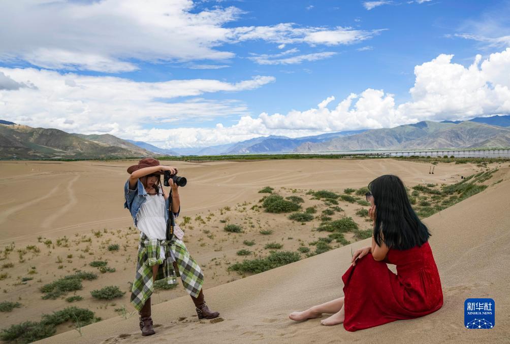 在扎囊沙漠公園,游客拍照留念(7月16日攝)。