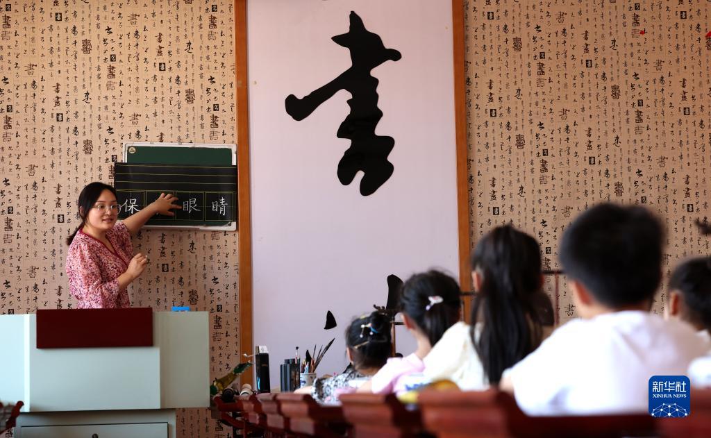 7月17日,在石家莊市建設北大街小學(xué)免費托管服務(wù)“寫(xiě)字課”上,老師為孩子們講硬筆書(shū)法知識。