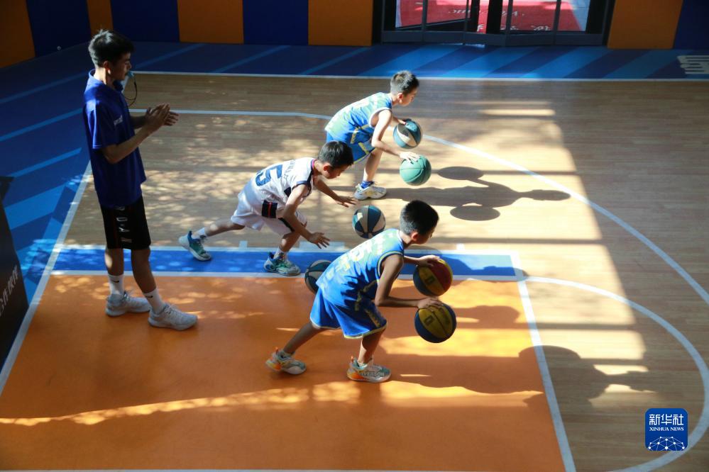 7月17日,在山東省高密市一籃球訓練營(yíng),孩子們在進(jìn)行籃球基本功訓練。