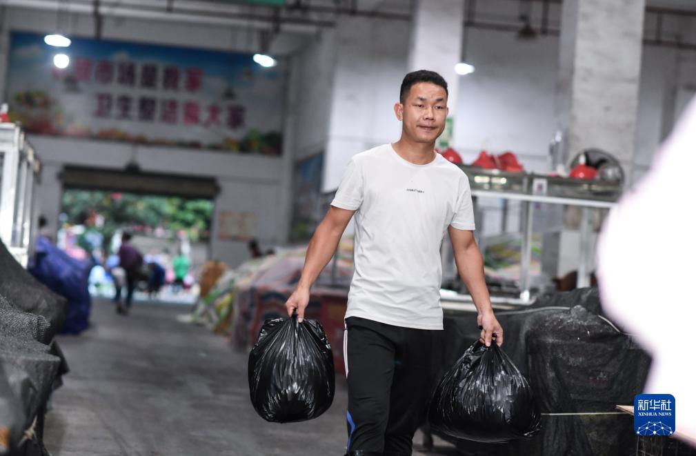7月15日,豐樂(lè )村一隊球員賈勇輝在農貿市場(chǎng)給客戶(hù)分發(fā)豆芽。