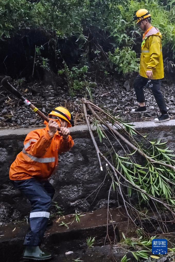 7月18日,國鐵南寧局沿海鐵路公司職工在清理被臺風(fēng)吹倒的樹(shù)木。當日,國鐵南寧局沿海鐵路公司組織職工利用軌道車(chē),在風(fēng)雨中對西部陸海新通道鐵路沿線(xiàn)進(jìn)行巡檢,對線(xiàn)路和防洪重點(diǎn)處所進(jìn)行全面巡查,及時(shí)處理危竹危樹(shù)、接觸網(wǎng)設備隱患等問(wèn)題,全力確保鐵路運行安全。