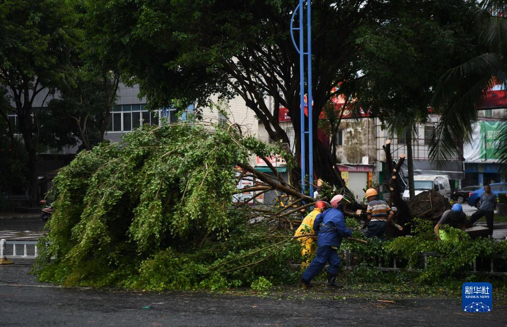 7月18日,在廣東湛江市軍民路,市政人員在清理倒伏樹(shù)木。
