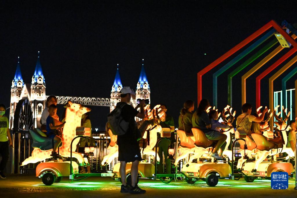 在新疆布爾津縣七彩河休閑旅游度假區,游客乘坐觀(guān)光車(chē)游覽(7月18日攝)。