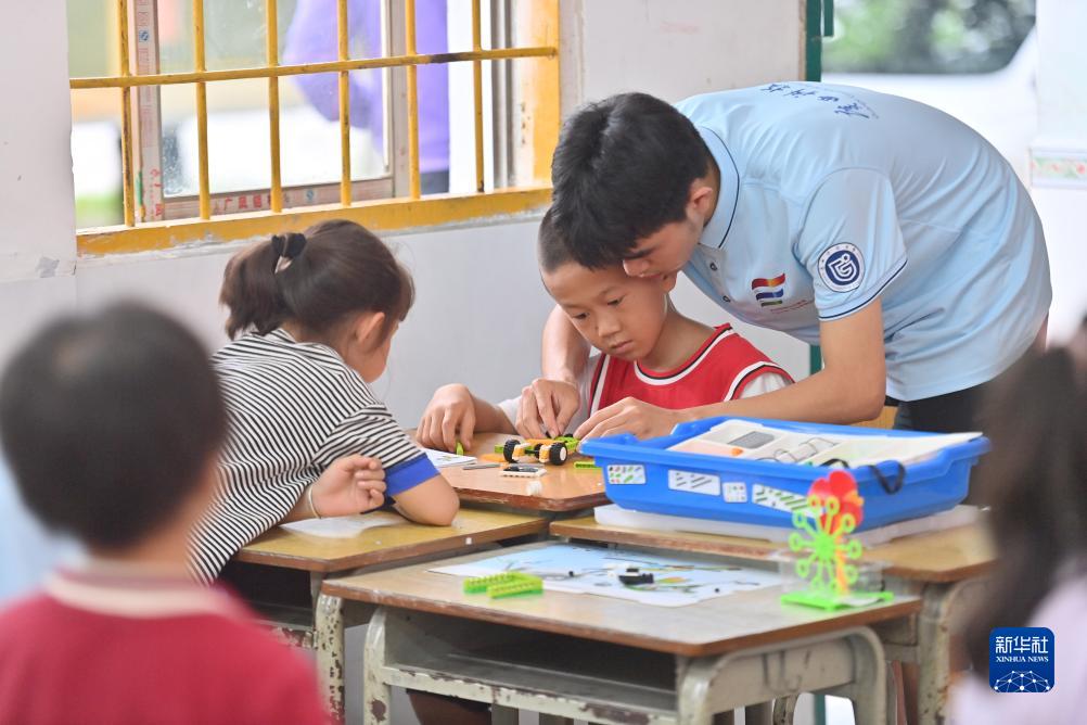 7月18日,在柳州市融安縣泗頂鎮中心小學(xué),大學(xué)生在指導小學(xué)生組裝機器人。
