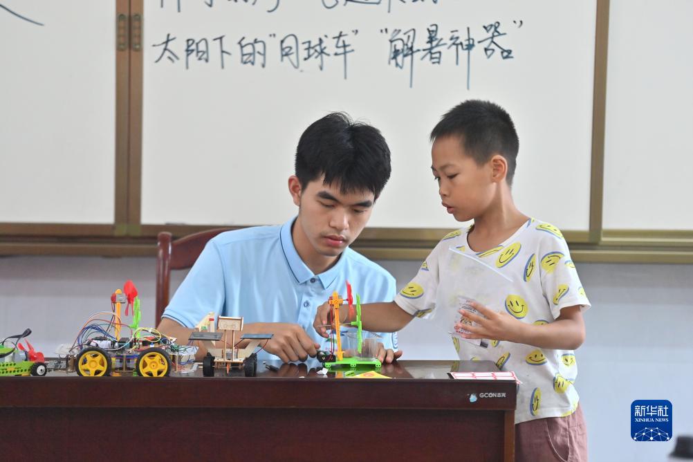 7月18日,在柳州市融安縣泗頂鎮中心小學(xué),大學(xué)生在指導小學(xué)生組裝機器人。