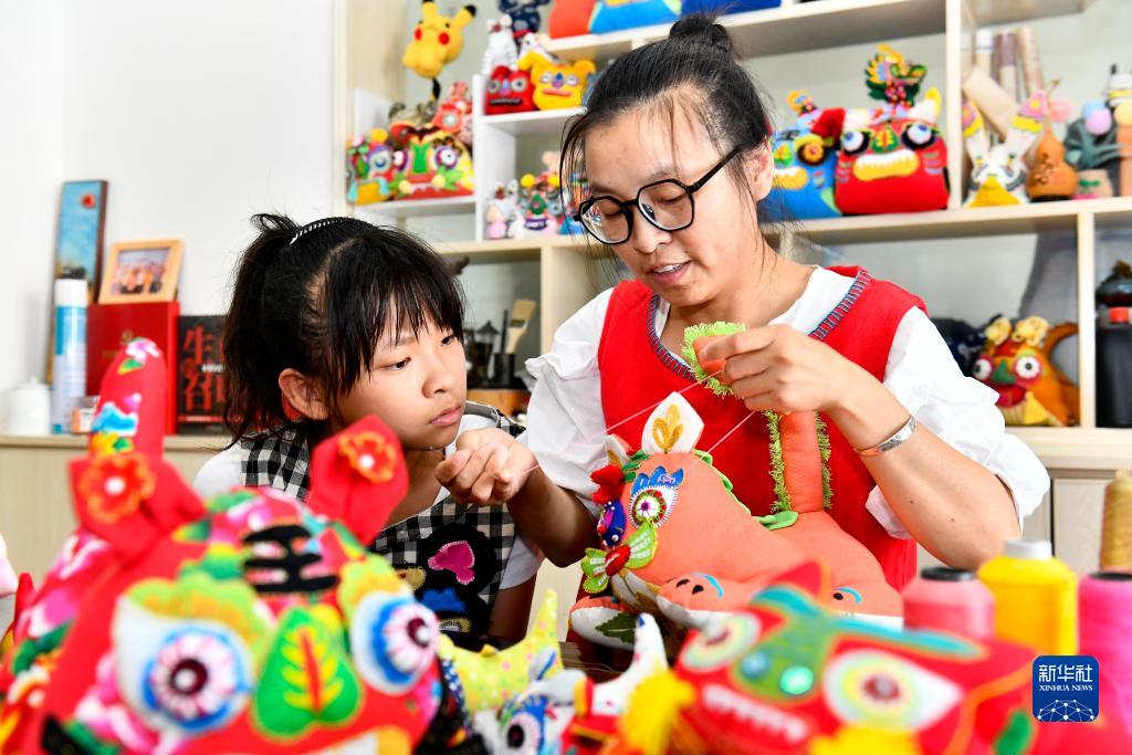 7月19日,在威海市文登區孫曉麗布玩具非遺工作室,非遺傳承人孫曉麗教女兒布老虎制作技藝。