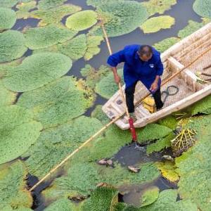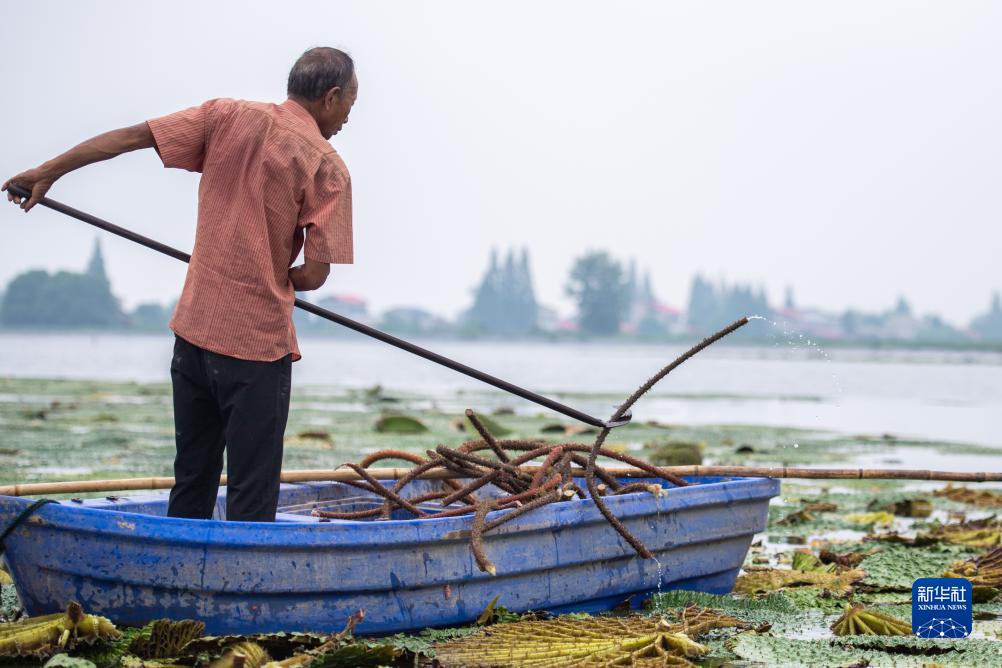 7月19日,在南縣麻河口鎮曹家鋪村,村民在采收芡實(shí)根莖。