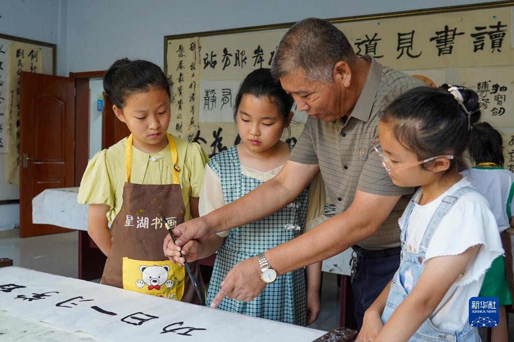 7月19日,在無(wú)棣縣棣豐街道星湖社區服務(wù)中心,志愿者教孩子們寫(xiě)毛筆字。