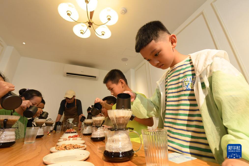 7月19日,青少年在小西街一家咖啡館體驗手沖咖啡制作。