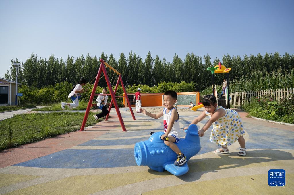 7月19日,孩子們在河北省唐山市豐南區趙新莊村一處游園內玩耍。