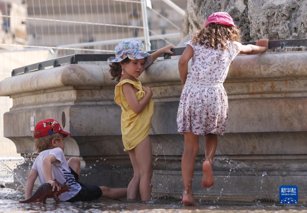7月19日,在法國南部城市蒙彼利埃的喜劇廣場(chǎng),孩子們在噴泉里納涼。