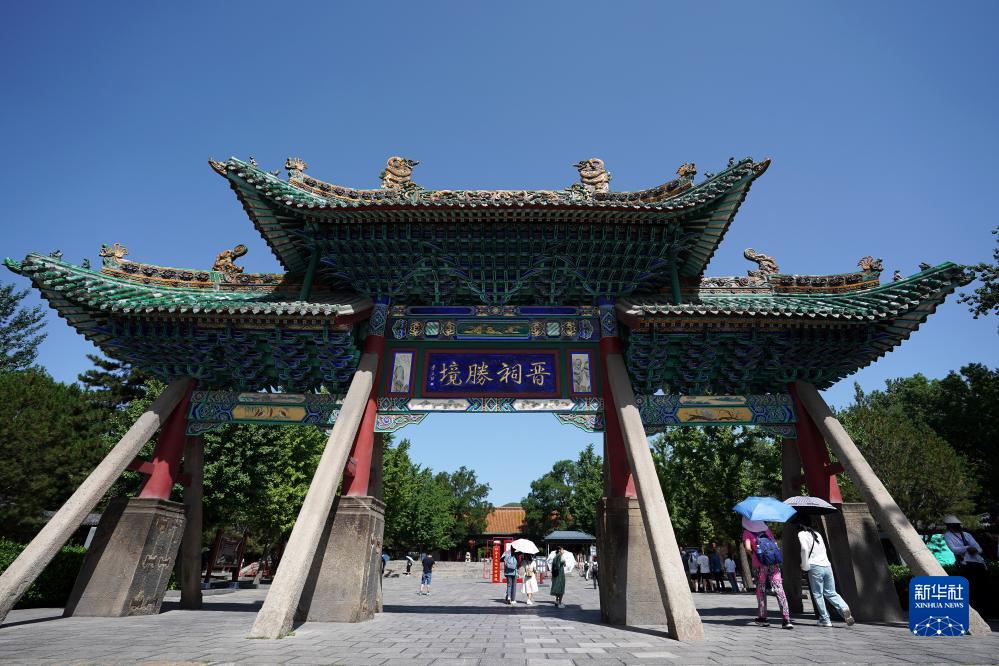游客在晉祠游覽(7月4日攝)。
