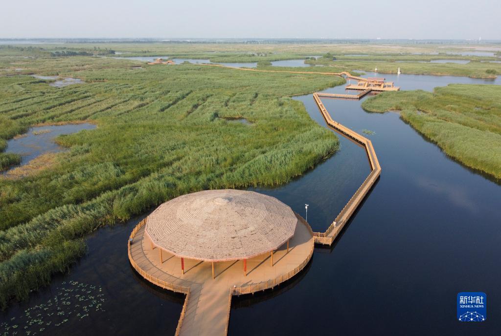 這是7月19日拍攝的白洋淀木棧道(無(wú)人機照片)。