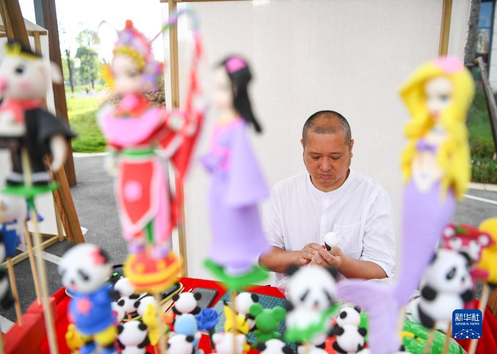 7月16日,在成都高新區桂溪生態(tài)公園,一位非遺傳承人在演示非物質(zhì)文化遺產(chǎn)捏泥人。