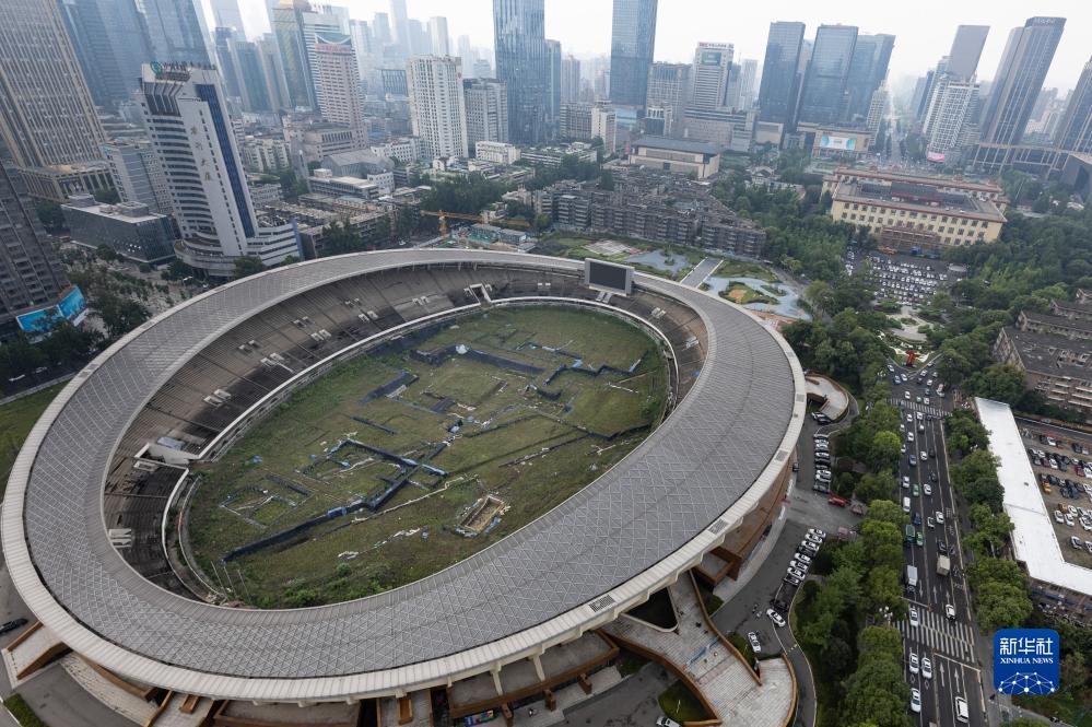 俯拍位于成都市中心的東華門(mén)遺址公園,成都體育中心立于遺址之上(7月19日攝),東華門(mén)遺址公園于7月20日對公眾開(kāi)放。