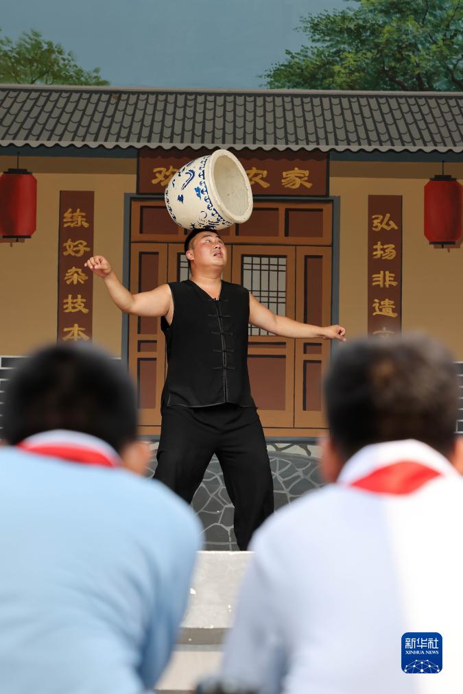 7月20日,在河北省滄州市吳橋縣吳橋雜技大世界景區,雜技演員為吳橋縣新興路小學(xué)學(xué)生展示傳統雜技項目。
