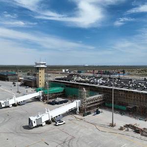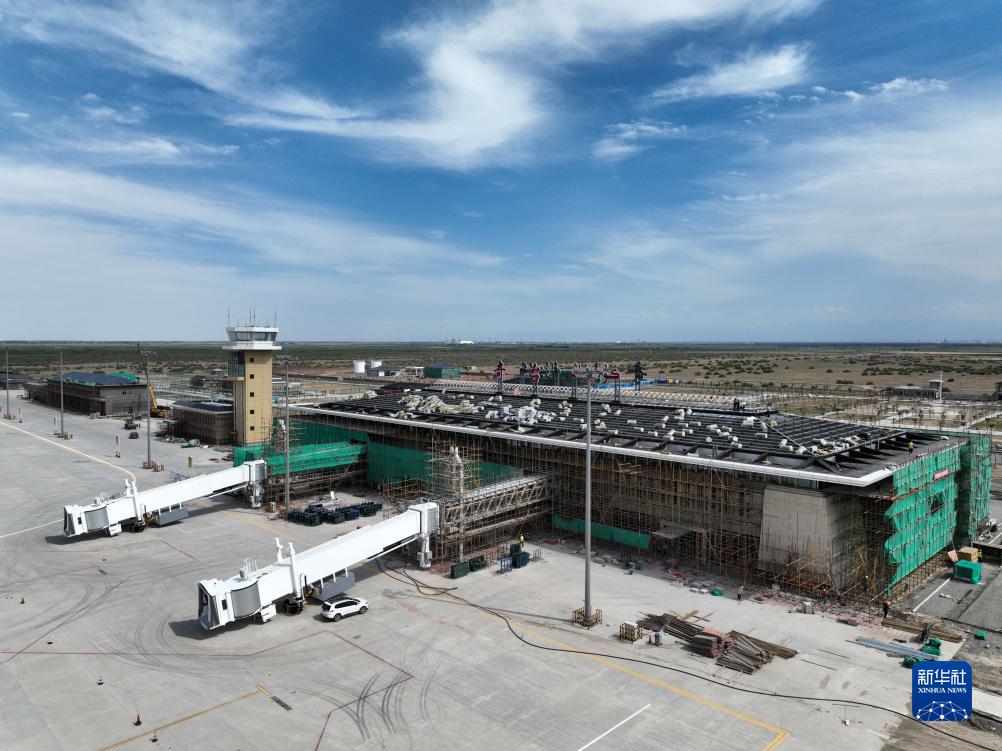 這是正在進(jìn)行外立面裝飾施工的新疆奇臺江布拉克機場(chǎng)航站樓(7月20日攝,無(wú)人機照片)。