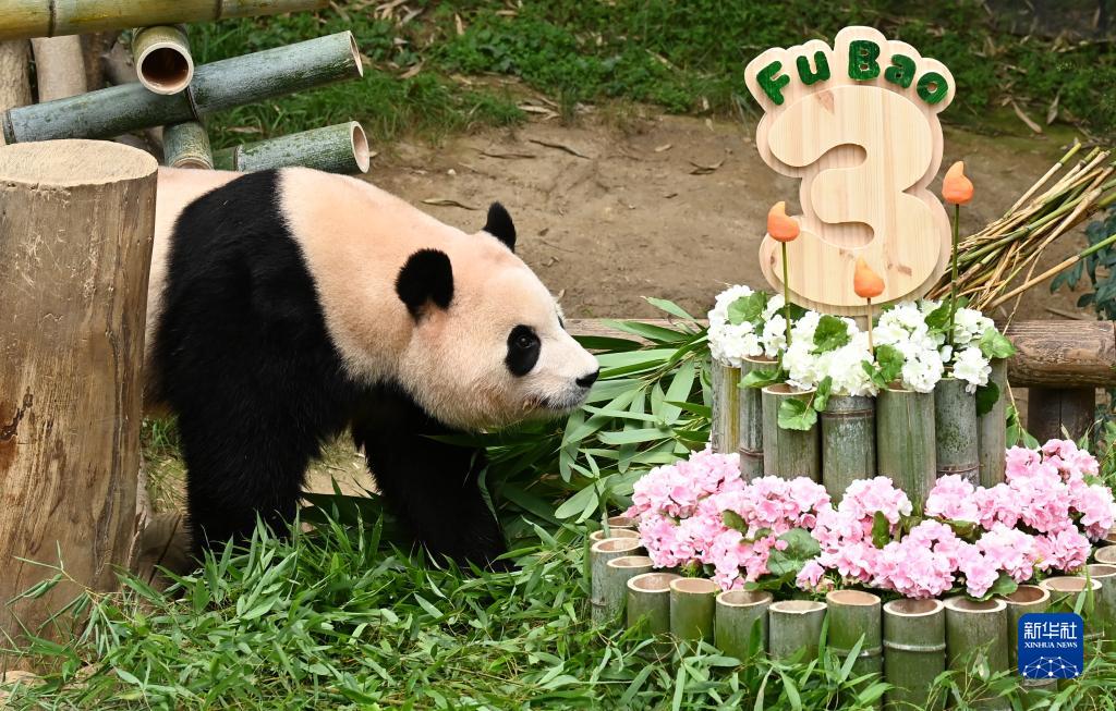 當日,在韓國出生的大熊貓“福寶”迎來(lái)3歲生日,園區制作了由竹子和胡蘿卜組成的“蛋糕”為其慶生。