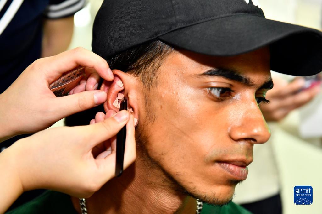 7月20日,在中國石油大學(xué)(華東)沉浸式中醫藥文化體驗中心,留學(xué)生在體驗耳穴壓豆中醫療法。