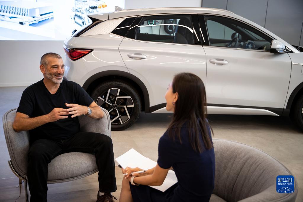 7月17日,在以色列特拉維夫一家比亞迪銷(xiāo)售點(diǎn),以色列財經(jīng)媒體《經(jīng)濟學(xué)人報》汽車(chē)版作家托默·哈達爾接受新華社記者采訪(fǎng)。