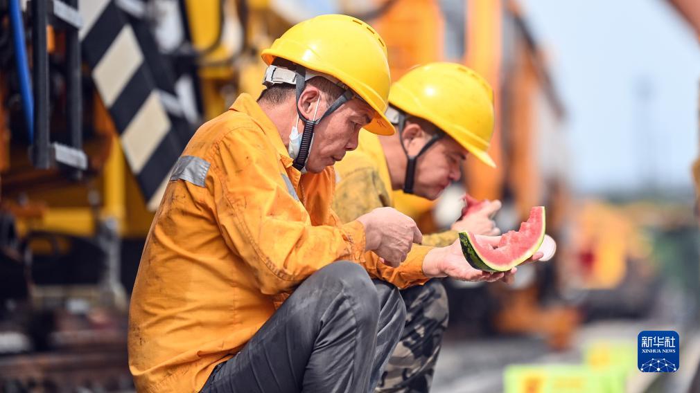 7月21日,國鐵南寧局沿海鐵路公司欽州工務(wù)段工人吃西瓜消暑。