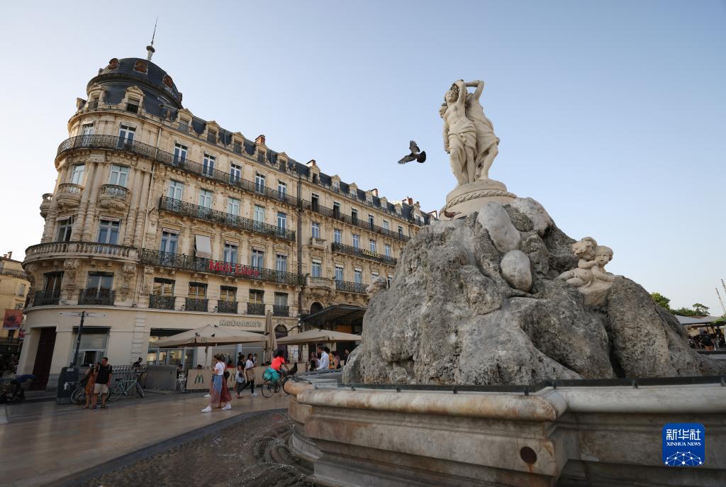 這是法國蒙彼利埃喜劇廣場(chǎng)上的噴泉(7月17日攝)。
