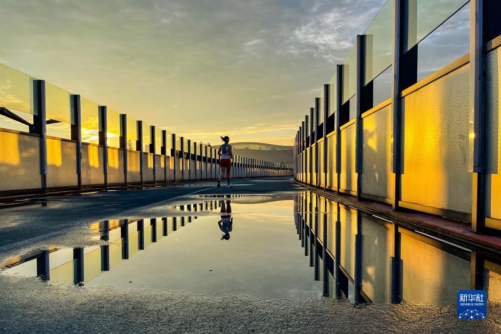 市民在成都錦城湖公園的綠道上晨跑(2021年7月17日攝)。