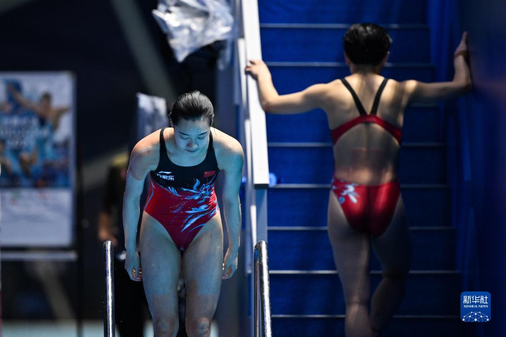 7月21日,中國選手昌雅妮(左)最后一跳結束,陳藝文(右)準備最后一跳。