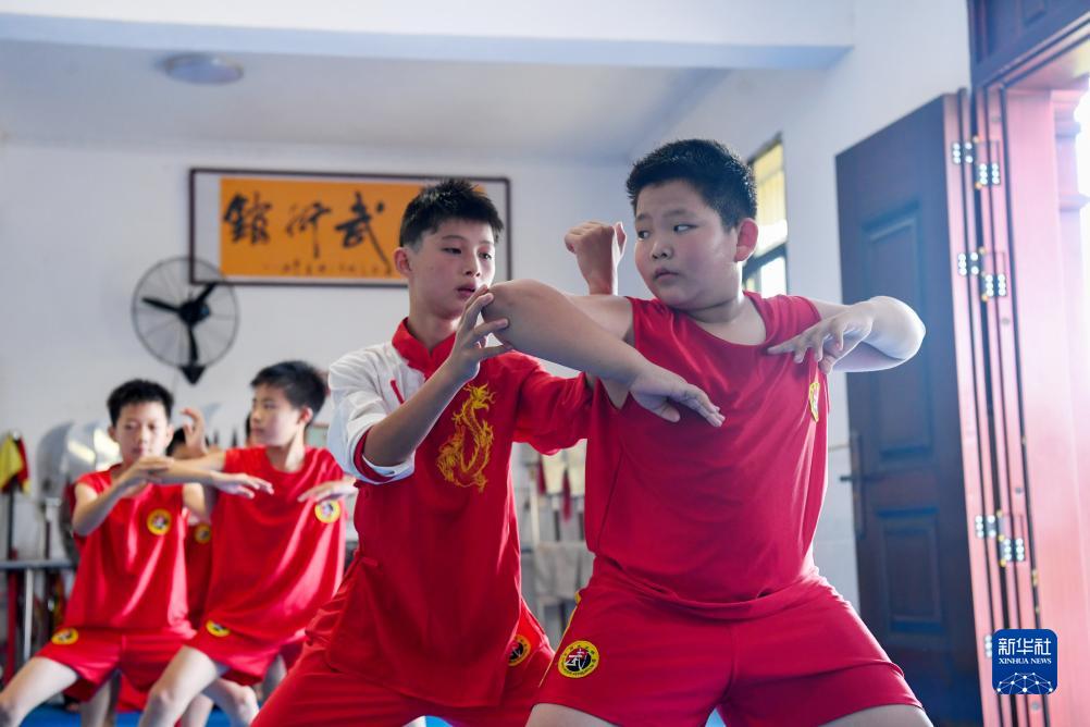 7月21日,在江西省宜春市袁州區南廟鎮白馬村鄉村武館,孩子們在進(jìn)行武術(shù)套路練習。