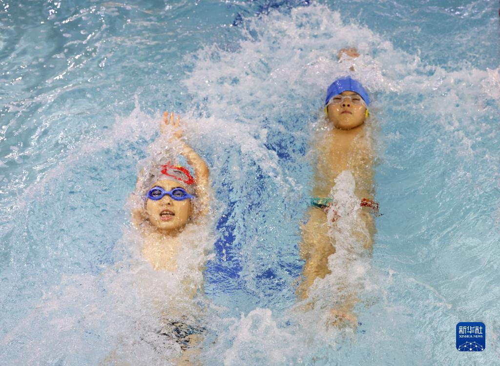 7月21日,學(xué)生在山東省棗莊市一家游泳館內練習游泳。