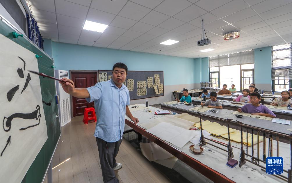 7月21日,在貴州省銅仁市印江土家族苗族自治縣一家書(shū)畫(huà)培訓中心,老師指導孩子們練習書(shū)法。