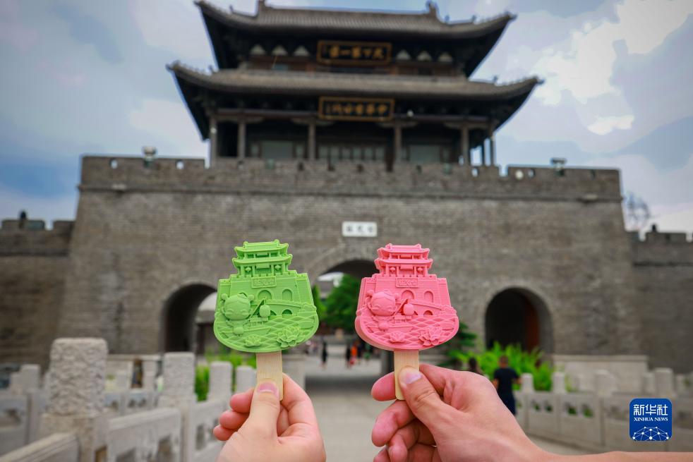 7月20日在山東省棗莊市臺兒莊古城拍攝的臺兒莊古城墻造型文創(chuàng )雪糕。
