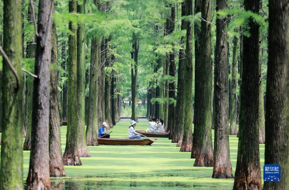 7月21日,游客在江蘇省揚州市江都區淥洋湖濕地公園的水上森林乘船游覽。