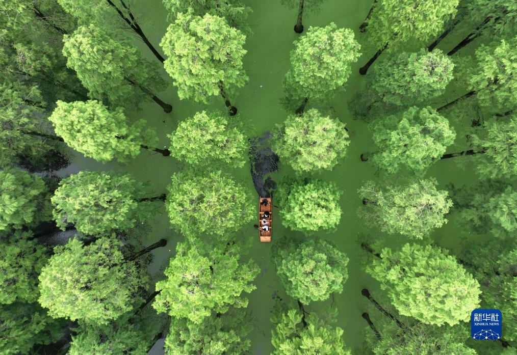 7月21日,游客在江蘇省揚州市江都區淥洋湖濕地公園的水上森林乘船游覽(無(wú)人機照片)。